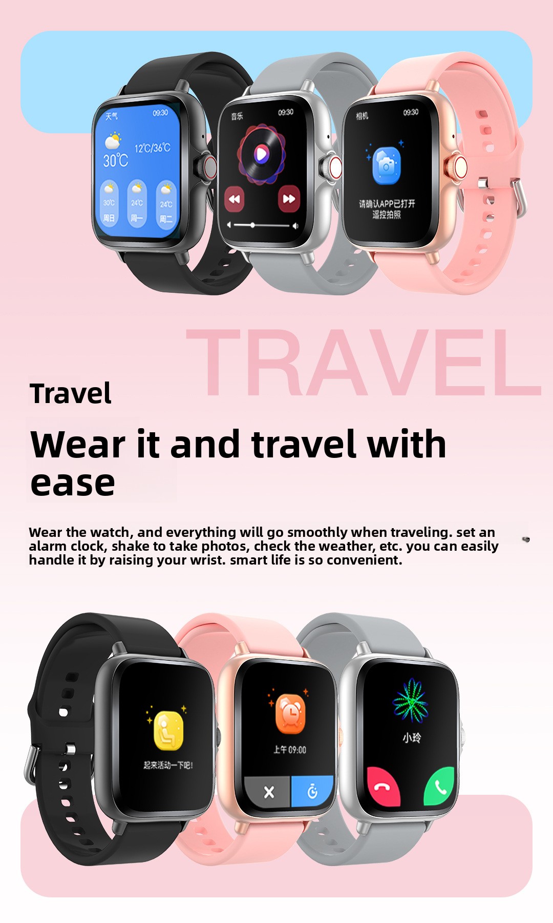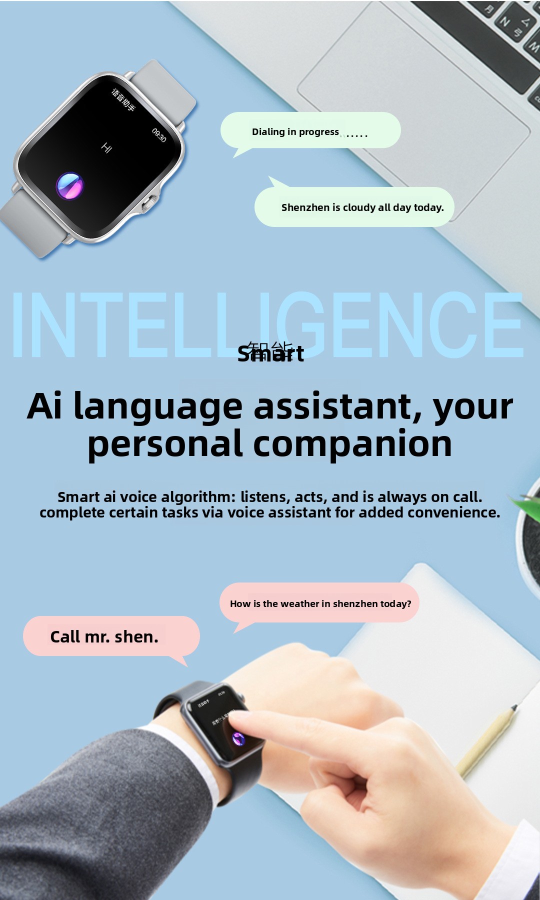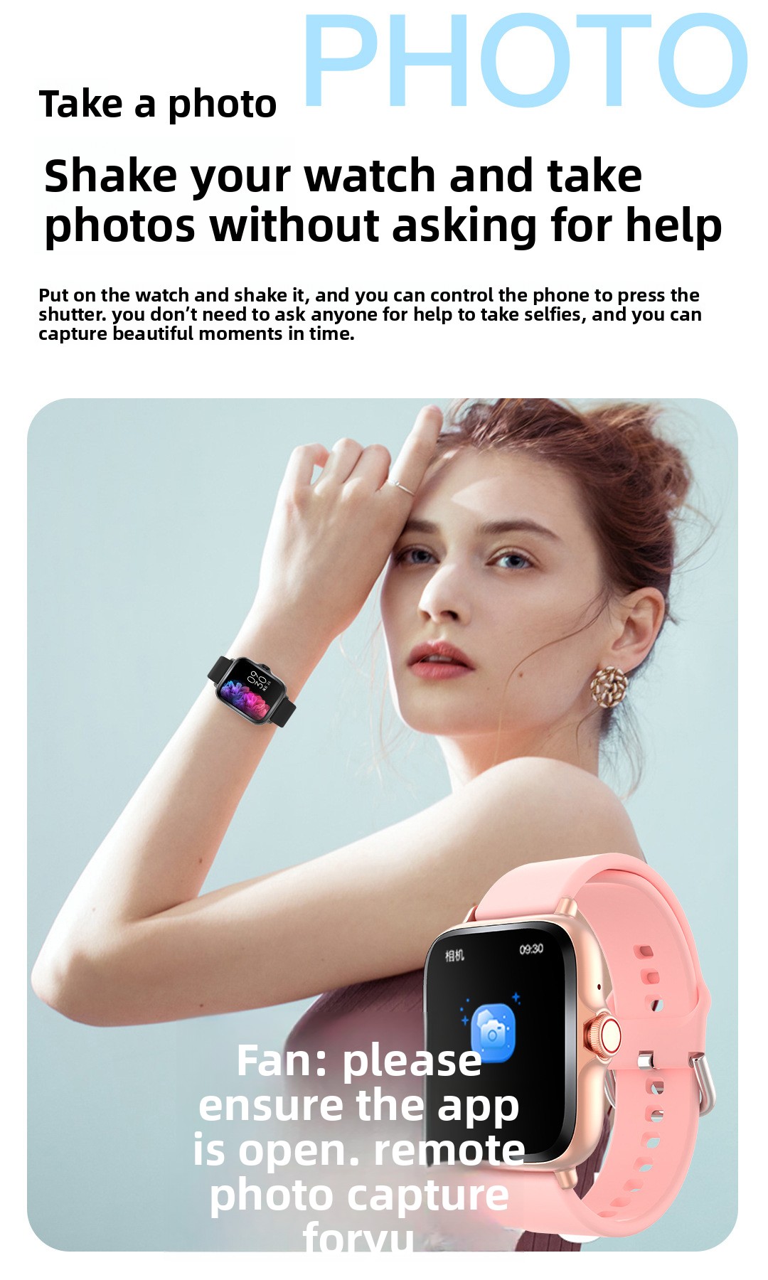 Functions: Step counting, Bluetooth call, smart reminder, remote selfie